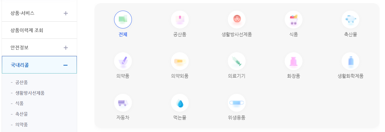 국내리콜 제품만으로도 많은 품목이 분류되어 있습니다.