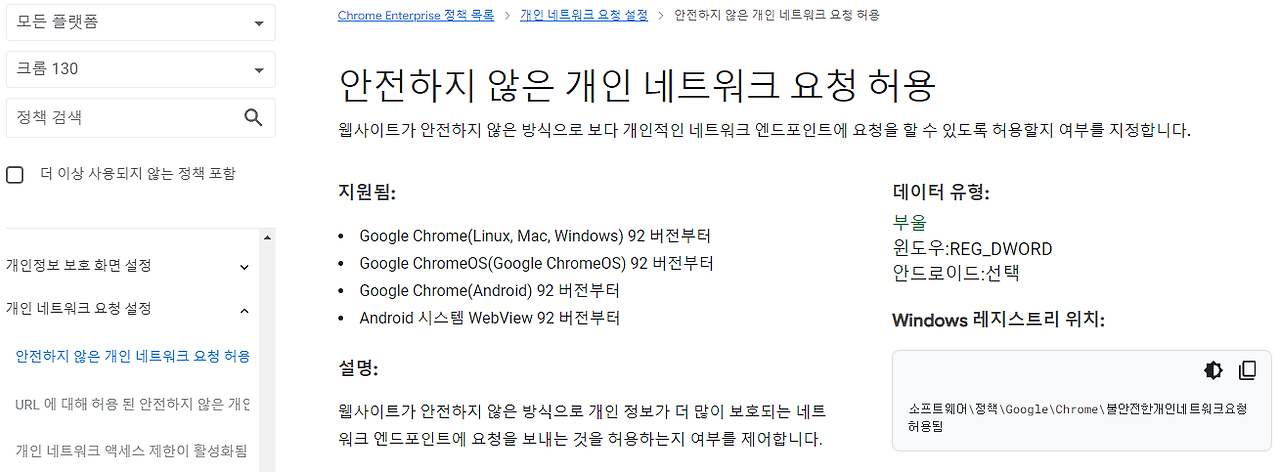 Chrome Policies 에 정책이름이 InsecurePrivateNetworkRequestsAllowed 라고 되어 있습니다.